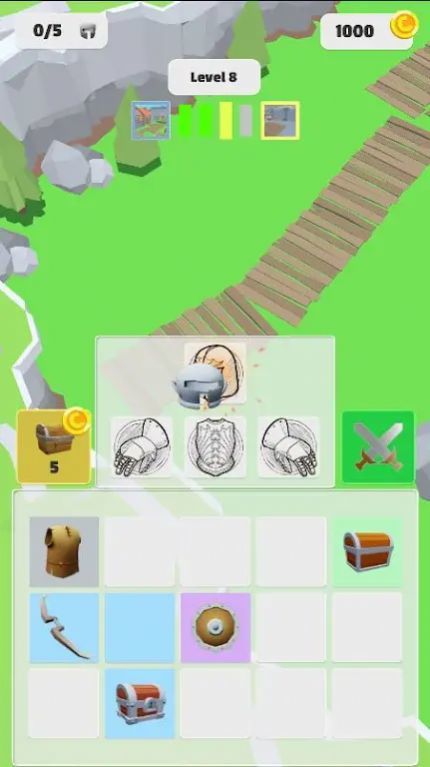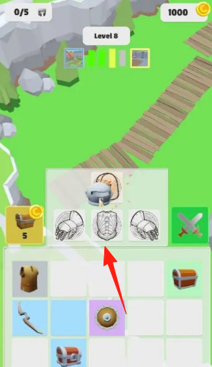 1、在Level8界面,点击箭头指向的装备图标,消耗金币(1000→980)【合成高阶装备】,提升角色防御攻击属性。