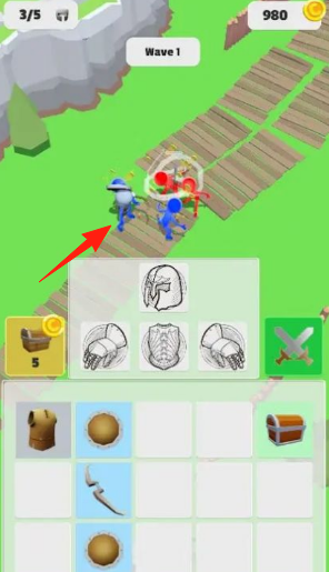 3、进入Wave1战斗,按箭头指引【操控角色移动】,利用合成装备的优势,攻击红色敌人,注意躲避伤害,完成波次挑战。