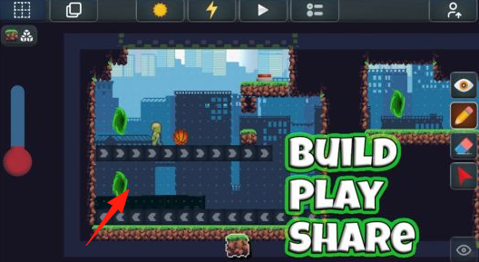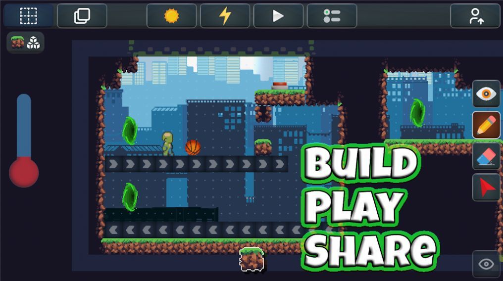 2、进入编辑界面,通过顶部工具(太阳、闪电等)设置场景规则,摆放元素(如篮球、角色)构建关卡,点击“Play”测试,完成后可分享作品。