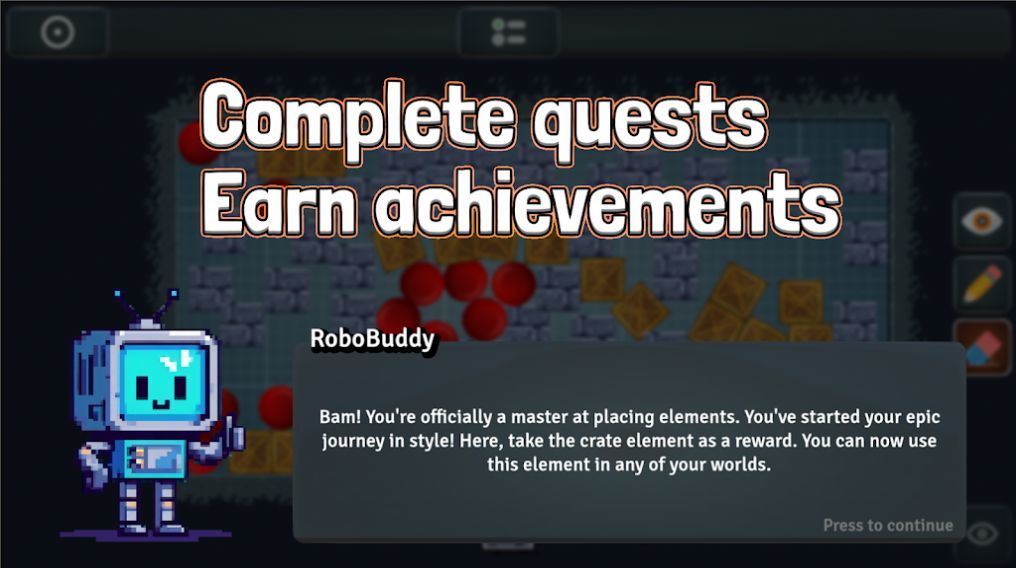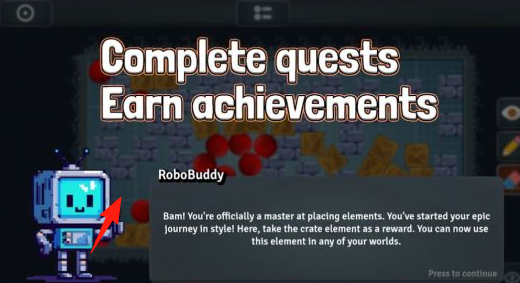 1、在任务成就界面,完成“放置元素”等基础任务,获取奖励(如crate元素)点击“Presstocontinue”继续,利用新元素拓展创作。