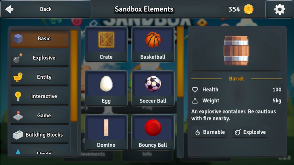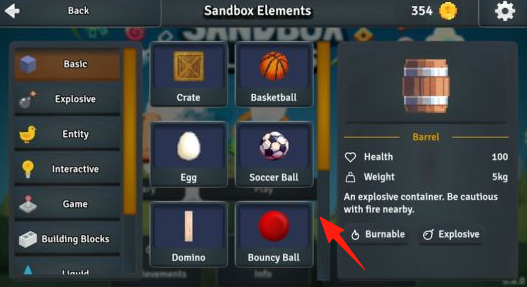 3、打开沙盒元素库,选择“Basic”“Explosive”等分类,查看元素属性(如Barrel的爆炸、燃烧特性),按需选取元素,拖拽到场景,丰富关卡内容与玩法。