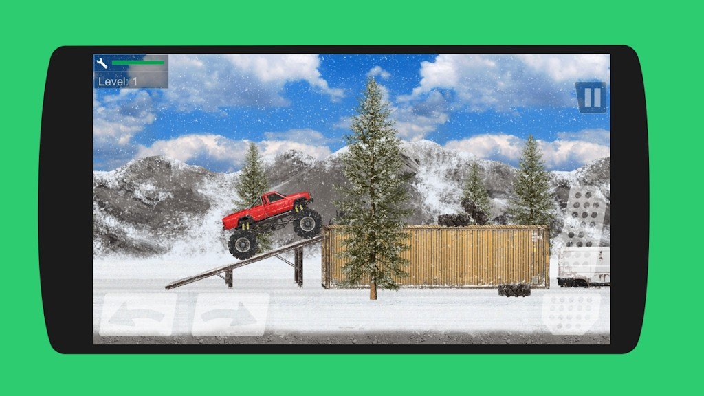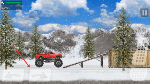 1、点击“NEW GAME”,选红色大脚车,进入Level1雪地场景,开启越野挑战,熟悉左右按键控方向。