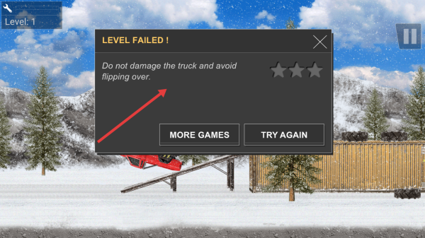 3、若失败(如翻车),点“TRY AGAIN”重试,牢记“避免损伤、不翻车”规则,反复练习提升越野技巧。