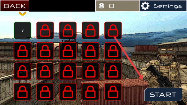 2、选关界面点击解锁关卡(如Level-1),再点【START】,进入战斗场景,准备射击敌人。