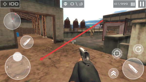 3、战斗中,用左侧摇杆移动,瞄准箭头指向敌人,点击射击按钮,消灭目标,推进关卡。