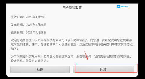 1、首次启动游戏时,会弹出用户协议页面,仔细阅读后点击同意按钮即可正式进入游戏主界面。