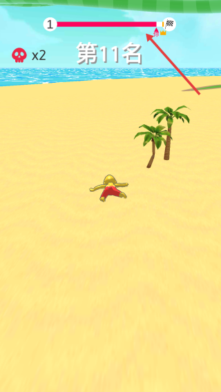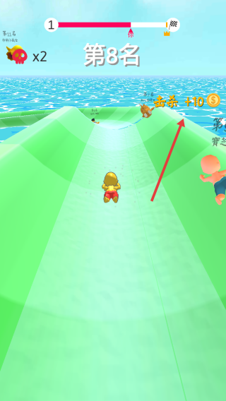 1、进入游戏,操控黄色角色在绿色跑道、沙滩等场景竞速,借左右移动避对手,提升排名(从15名→8名→11名)。