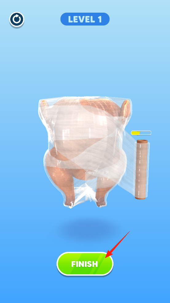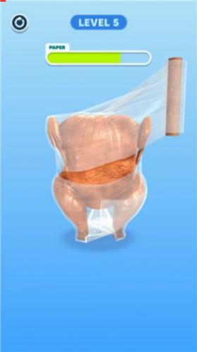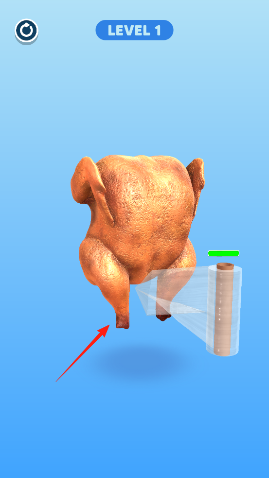 1、进入关卡1,面对一只完整的烤鸡和一卷保鲜膜,玩家需操控保鲜膜,从鸡腿部位开始,围绕烤鸡缠绕,按照提示方向(红色箭头指引),均匀包裹烤鸡。