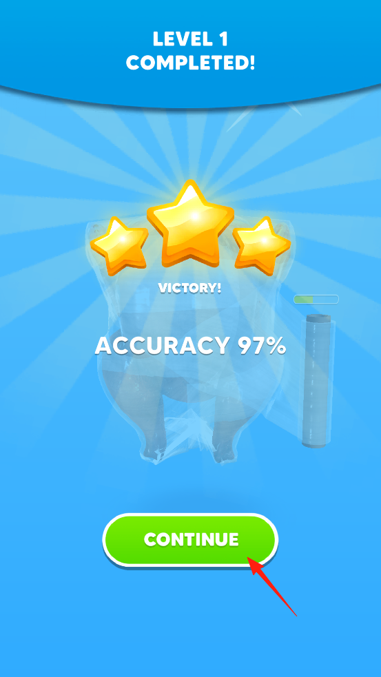 3、关卡1完成后,弹出“LEVEL1COMPLETED!”界面,显示“ACCURACY97%”等评价,点击“CONTINUE”进入下一关,可继续挑战更高难度的食品包装任务。
