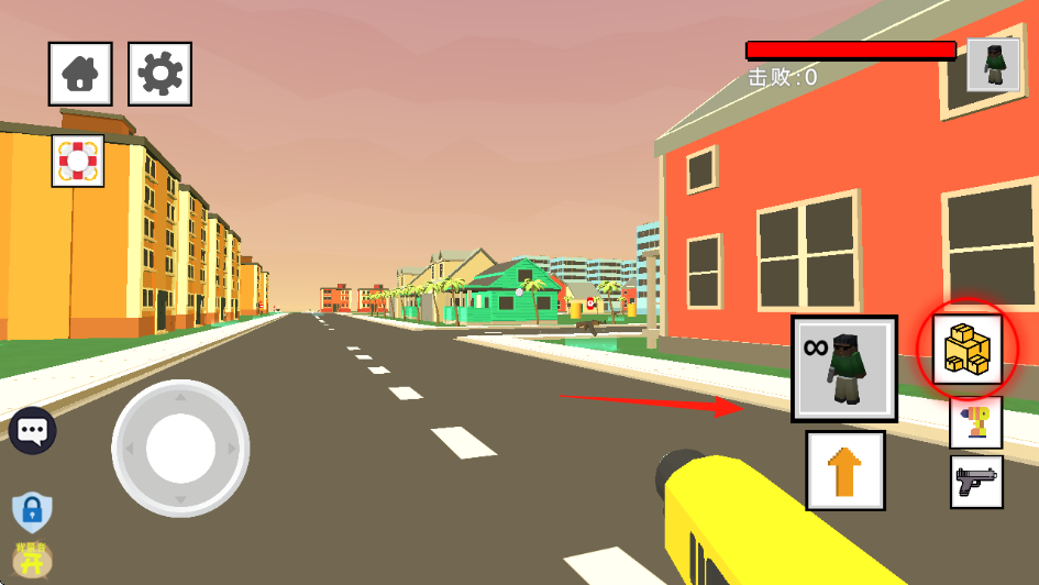 3、进入城镇场景,点击箭头标记的建造按钮,利用场景资源,搭建建筑、布置道具,推进沙盒玩法,或与NPC(墨镜人)互动接任务。