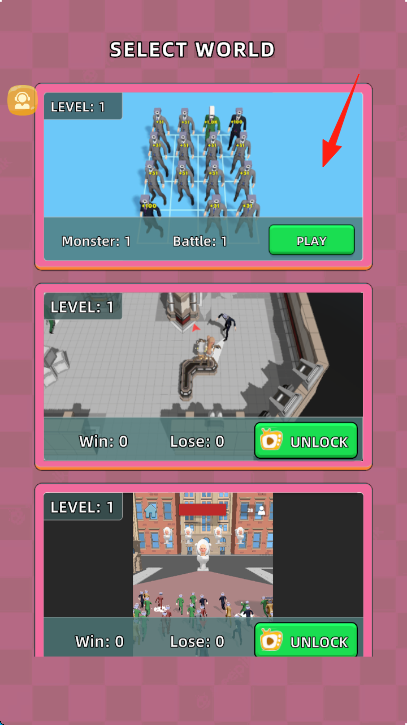 1、在“SELECTWORLD”界面,点击箭头指向的关卡(第一个),查看怪物、战斗信息,点击“PLAY”进入战斗准备。