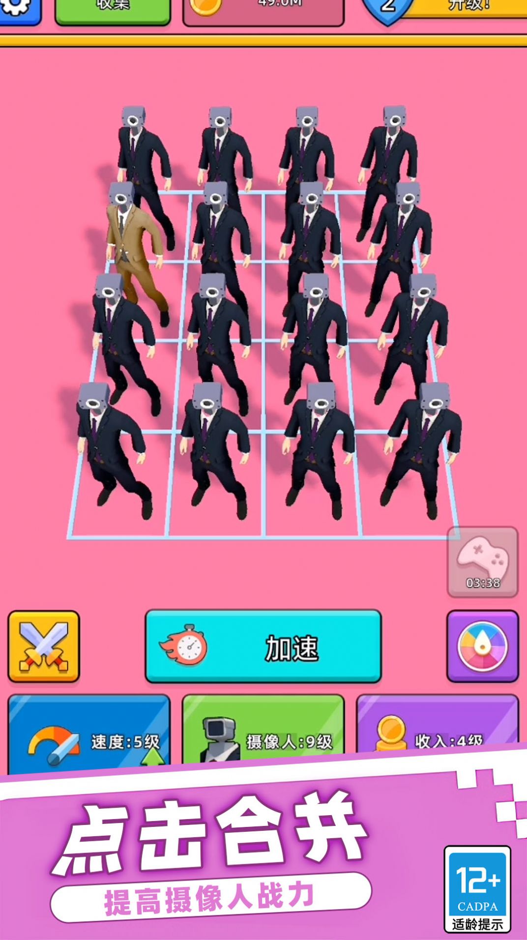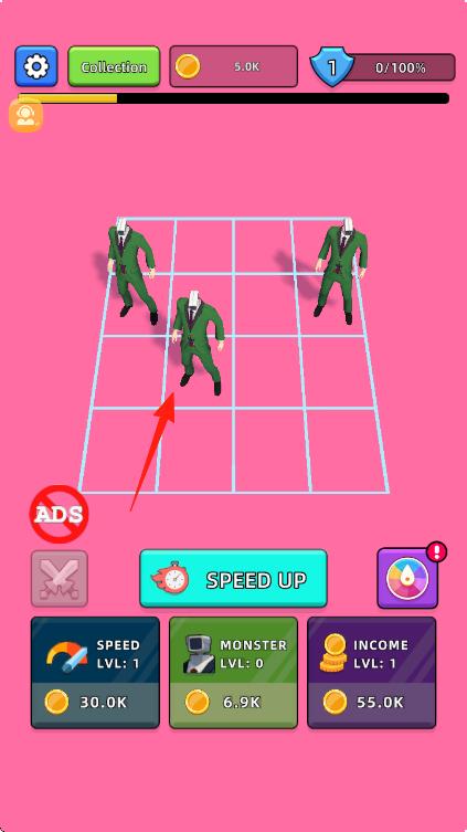 3、合成高阶角色后,点击“SPEEDUP”加速战斗,利用升级后的角色(棕色)输出,积累资源,解锁新关卡。