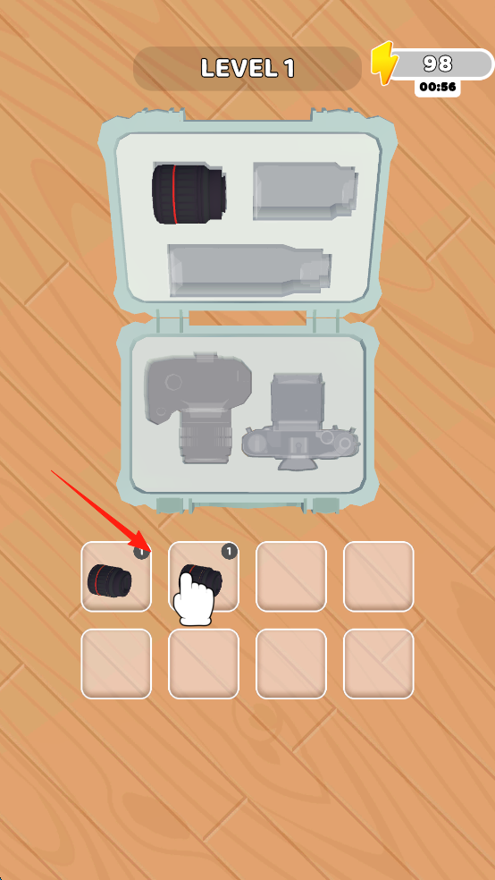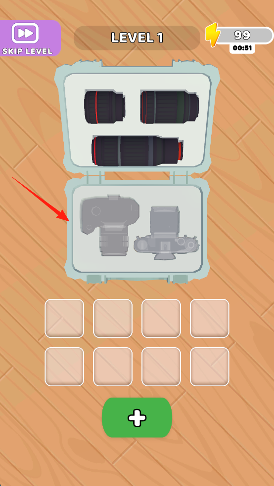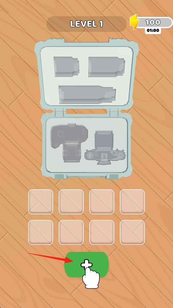 1、进入第一关,面对装有相机配件的空箱子与下方空格,点击绿色“+”按钮,随机获取相机零件,需在限时(1:00)内,通过不断获取零件,匹配箱子里的配件空位。