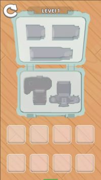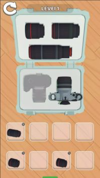 2、获取镜头零件后,下方空格出现零件,观察箱子里的配件形状、位置,将对应零件拖入箱子空位,匹配零件与箱子内的轮廓,感受零件装配的操作乐趣,逐步填满相机配件箱。