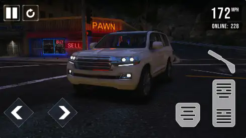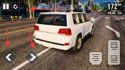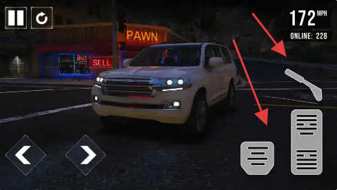 1、用左下角左右箭头控制车辆转向,右侧踏板控制加速 / 刹车,上方显示车速(如 172MPH )、在线人数(228 )等信息。