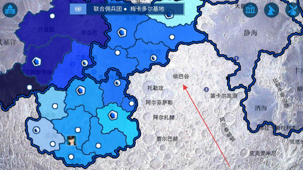 2、月球地图,显示“依巴谷”等区域,规划联合佣兵团作战布局。