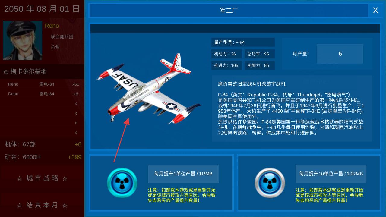 3、军工厂界面,查看F-84战机属性,可付费提升月产量。