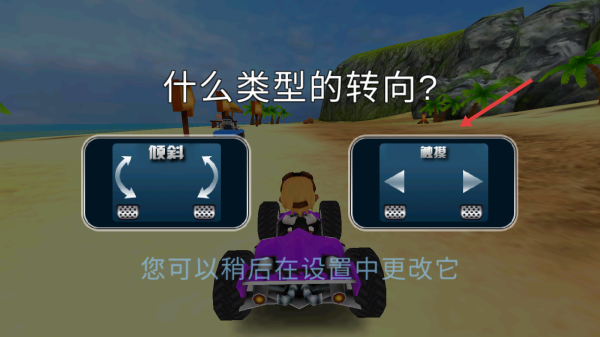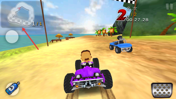 1、点击“开始游戏”,选“触摸”转向(易上手),进入沙滩赛道,操控紫色越野车竞速,留意小地图(左上角)规划路线。