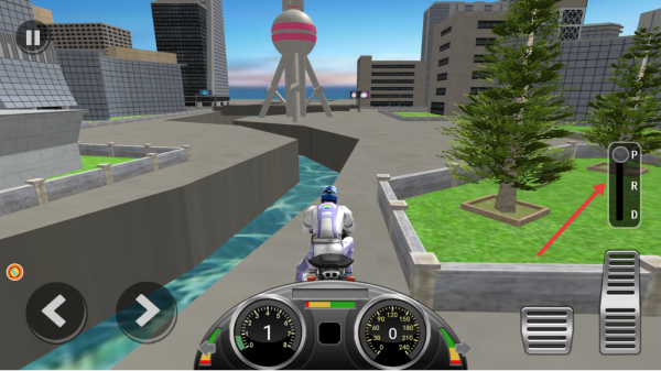 1、点击“开始游戏”,选摩托,进入城市赛道,熟悉挡位(P、R、D)、左右转向操作,准备极速驾驶。