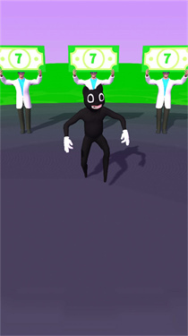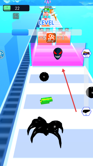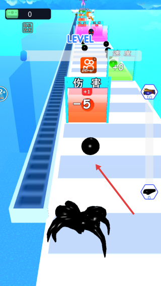 1、操控黑色角色(初始形态如蜘蛛、人形)在赛道前进,遇黑色球体、敌人(如红面怪)时,调整路线避伤害(如“伤害-5”“-1”)。