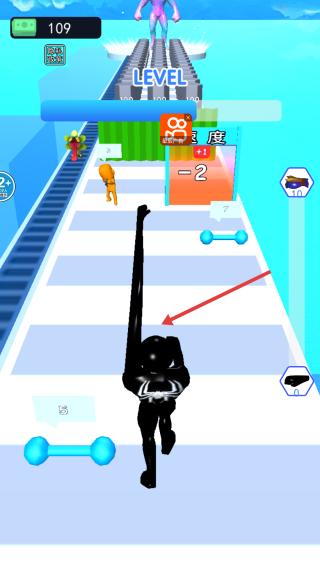 2、收集赛道道具(如绿色长条、哑铃),提升角色属性(攻击、速度等),应对后续关卡敌人与障碍。