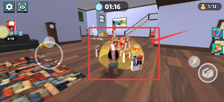 2、通过左下角摇杆滑动操控角色移动,在房间各个角落搜寻隐藏的饼干盒目标。