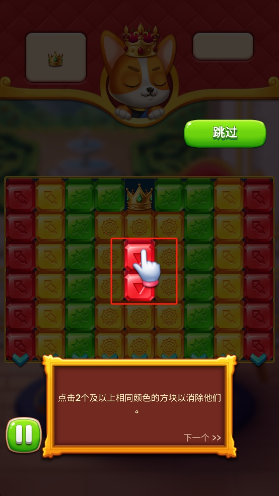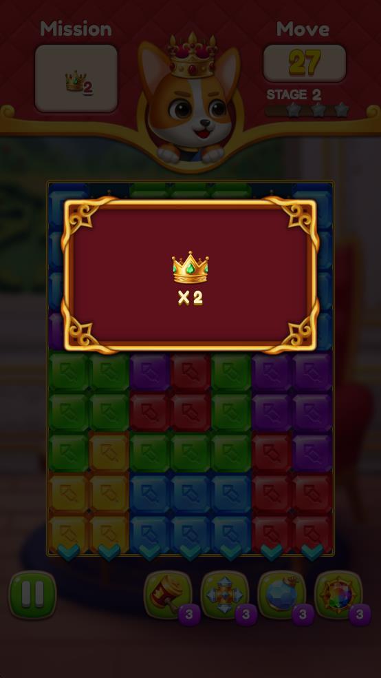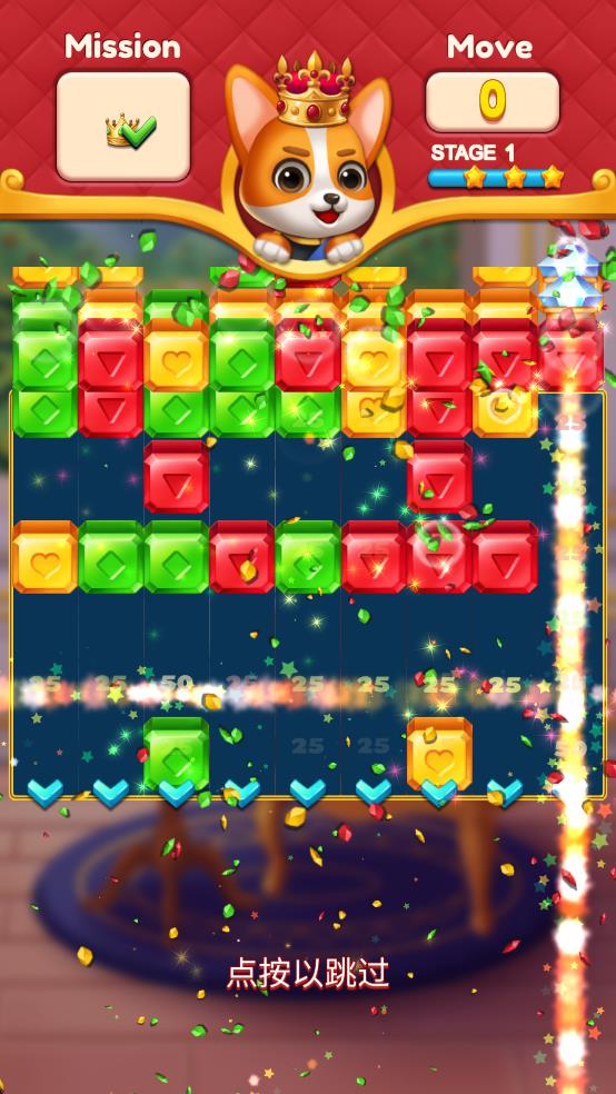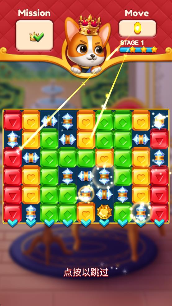 2、关卡内珠宝与城堡元素交织,尝试交换相邻珠宝,让三颗及以上同色珠宝相连,就能看到它们爆破消除时的萌趣效果。
