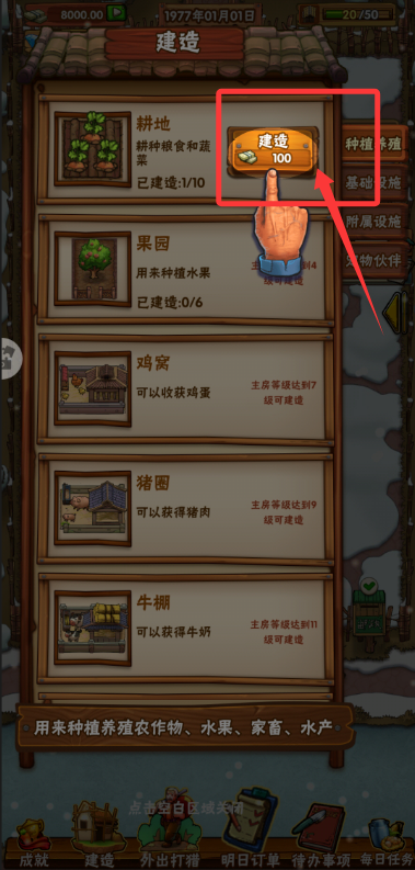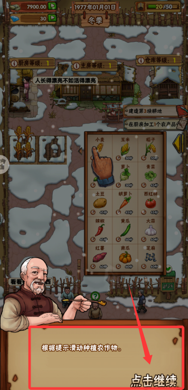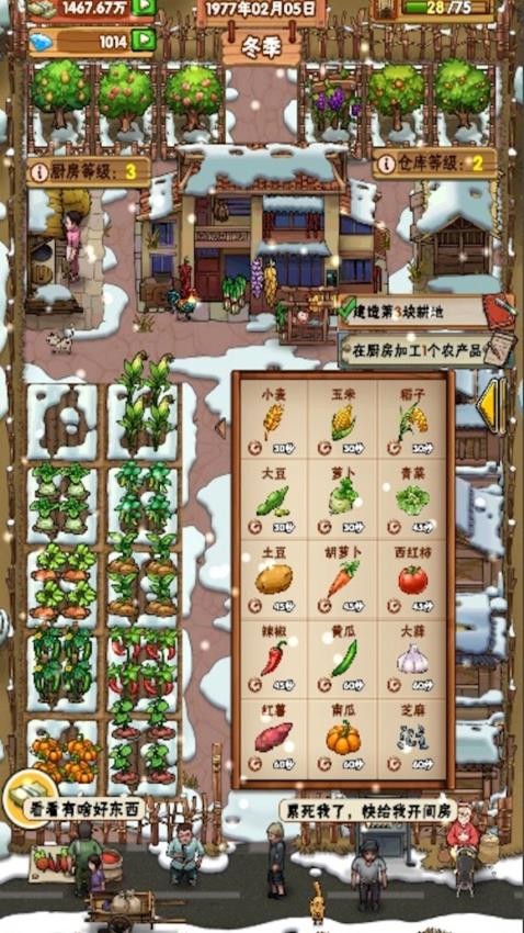 2、消耗金币开垦土地,播种各类瓜果蔬菜,等待作物成熟后获得丰收。