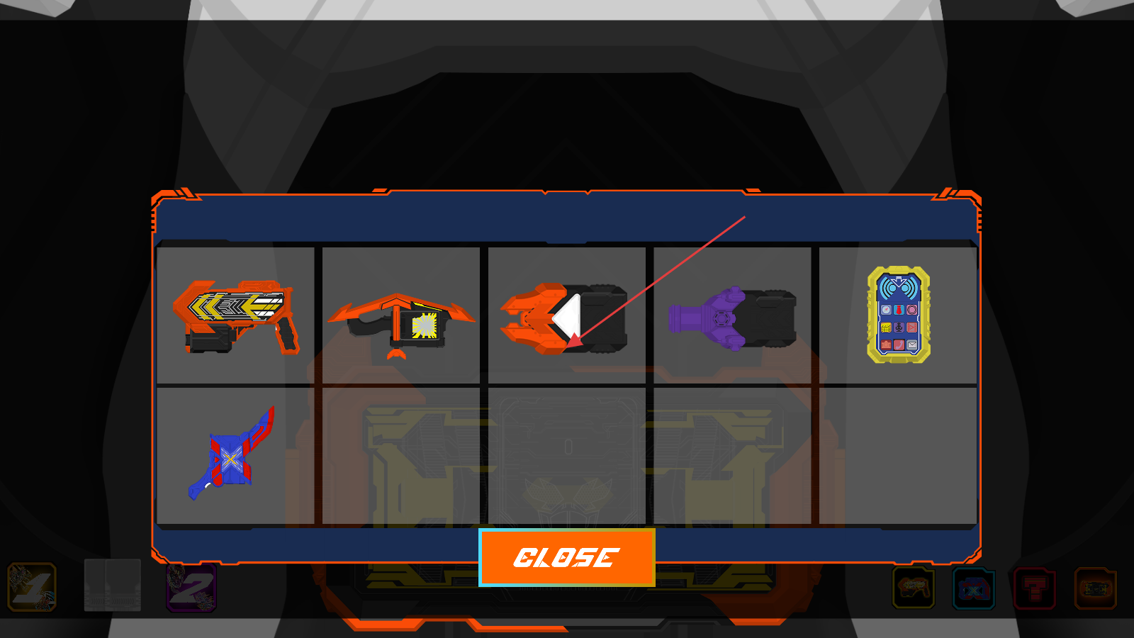 2、打开道具界面,浏览陈列武器,按需点击选取,搭配战斗,用完点【CLOSE】关闭,管理道具栏。