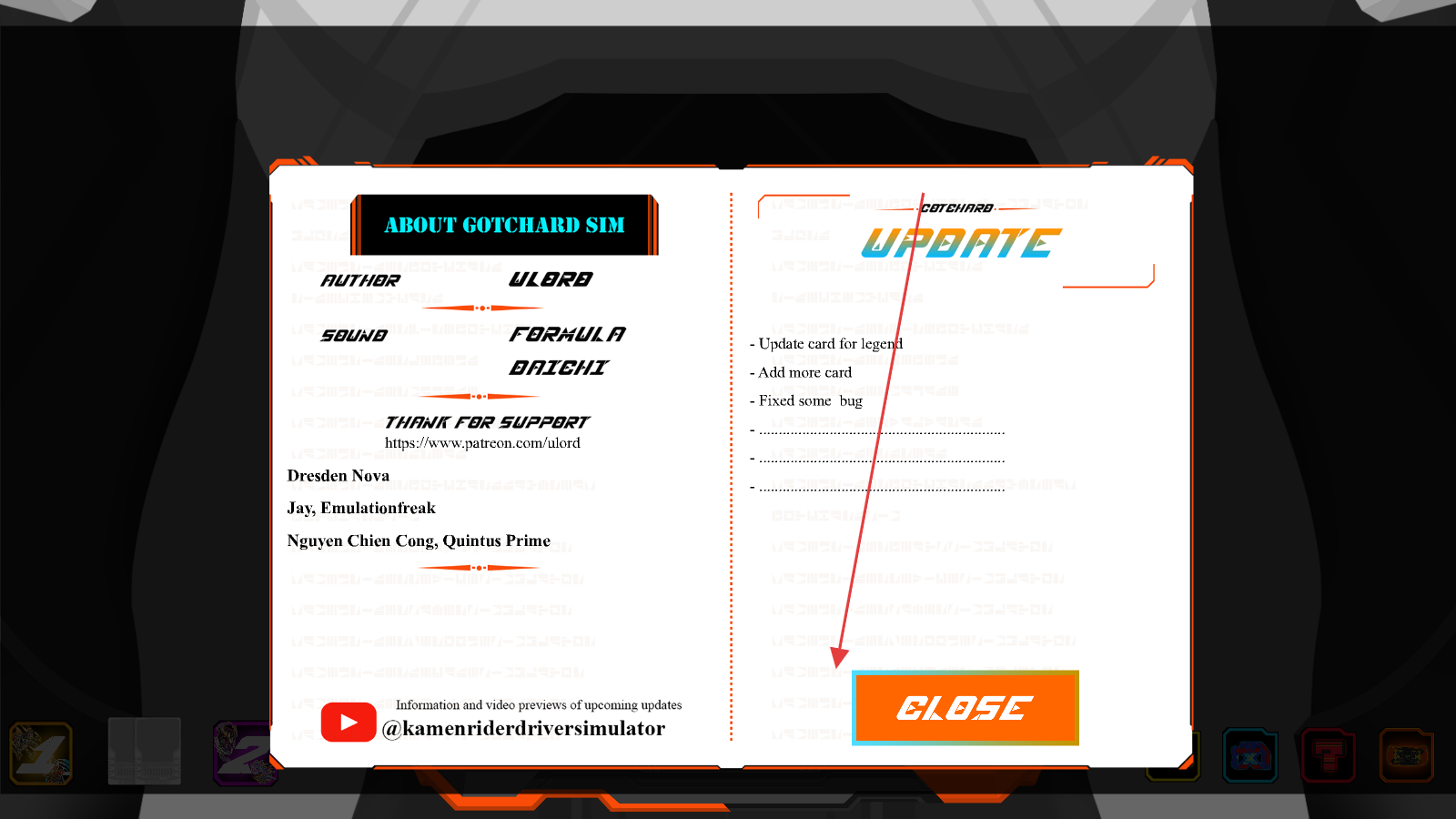 3、若遇关于界面,查看作者、更新等信息后,点【CLOSE】返回,了解游戏背景与更新内容,助力体验。