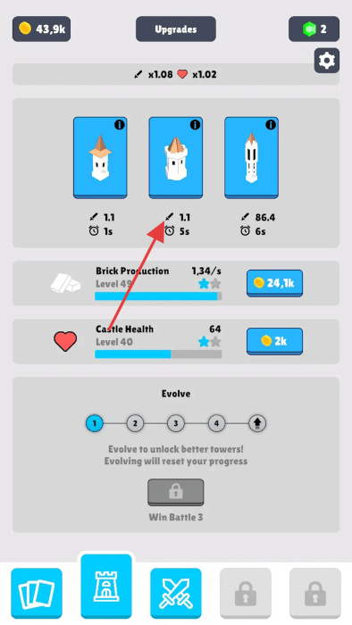 1、“塔楼升级”,在Upgrades界面,消耗金币(43.9k),提升塔楼(伤害、攻速)与城堡血量。