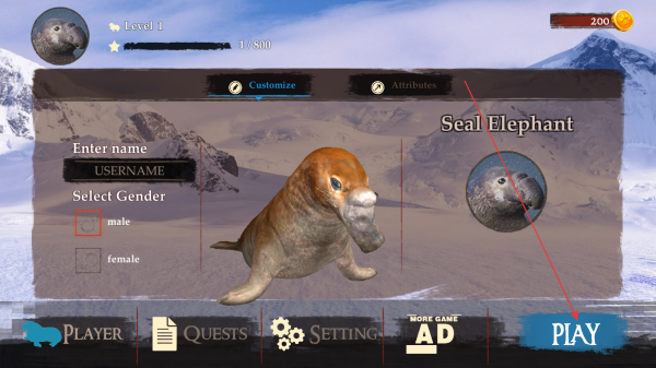 1、进入游戏,点击界面中间蓝色【PLAY】按钮,开启象海豹模拟冒险,这是进入游戏世界的第一步。