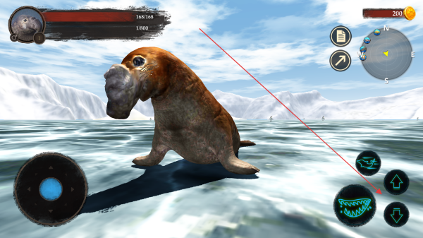 3、游戏中用左下角摇杆控制象海豹移动,右侧按键释放技能,留意血量和地图,在水域场景探索、完成目标推进游戏。