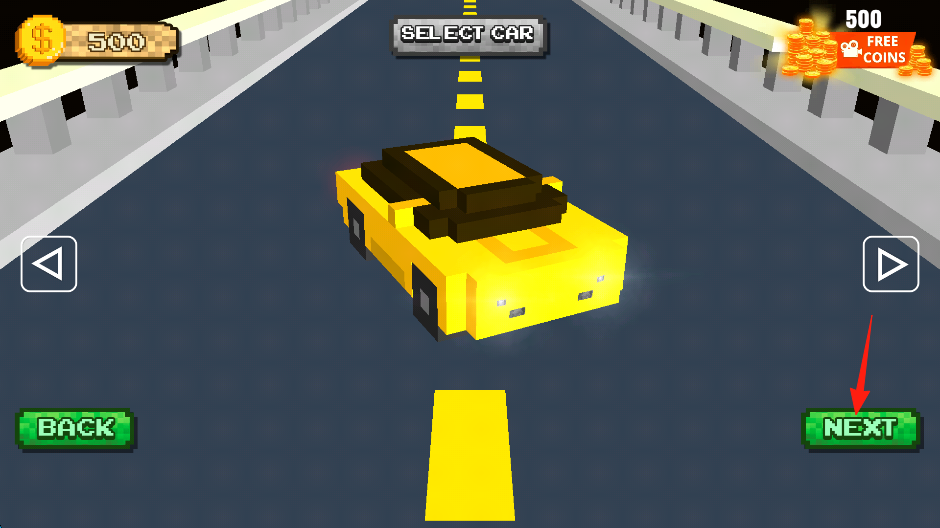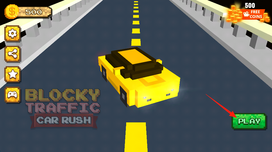 1、进入游戏主界面,点击“PLAY”开启像素赛车挑战,操控黄色小车在道路行驶,避开障碍,收集金币(如界面右侧“FREE COINS”),通过驾驶操作,体验像素风格的竞速乐趣。