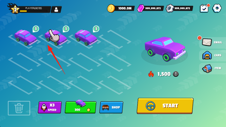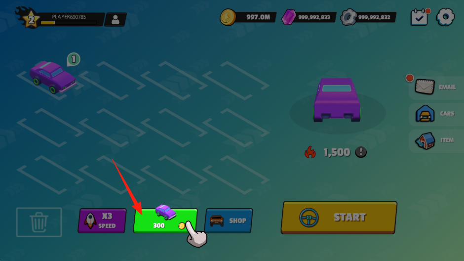 1、进入车库界面,点击绿色“300”按钮,消耗金币解锁新车辆,车库中已有的紫色车可进行升级或使用,通过解锁操作扩充车辆库,为后续比赛选择更多车型。