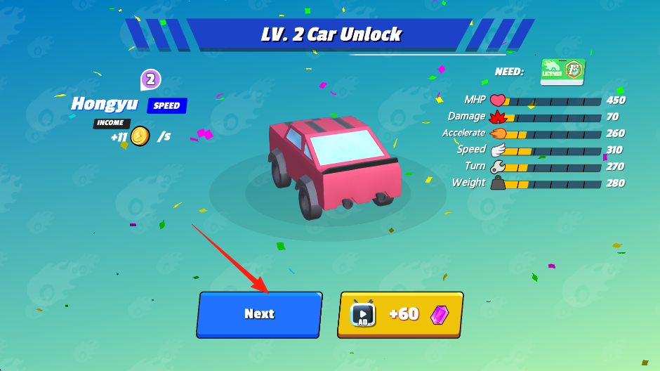 3、解锁新车辆(粉色“Hongyu”)后,查看车辆属性(速度、伤害等),点击“Next”继续解锁流程,或看广告获取额外奖励,通过解锁新车,提升车队实力。