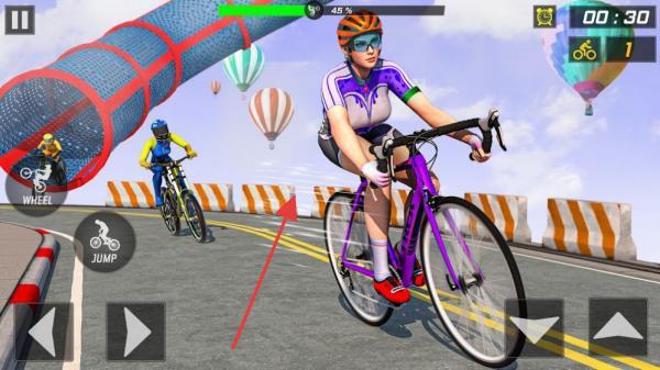 1、骑行时,遇到高空坡道,提前点击左侧【JUMP】键,让角色腾空越过,注意把握时机,借助热气球场景完成跳跃。