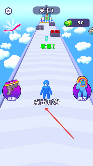 1、点击【点击开始】,进入“关卡1”跑道场景,画面有云朵、道具和障碍,准备开启收集、躲避的闯关挑战。
