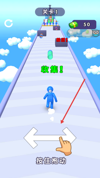 2、游戏时,按住下方【按住拖动】箭头左右滑动,精准控制蓝色角色移动,灵活躲障碍、高效收集道具。