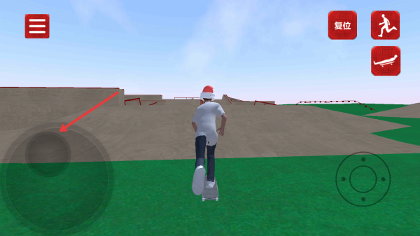 2、通过左侧虚拟摇杆控制角色移动方向,在草地地形向滑板赛道前进。