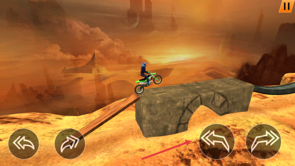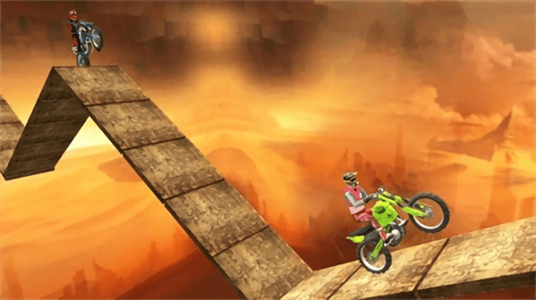 3、驾驶摩托时,通过屏幕两侧的按键精确控制平衡与转向,在遇到断桥等障碍时提前调整姿态,顺利跨越障碍完成关卡获取奖励。