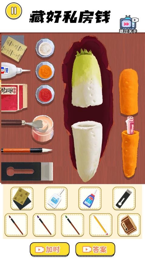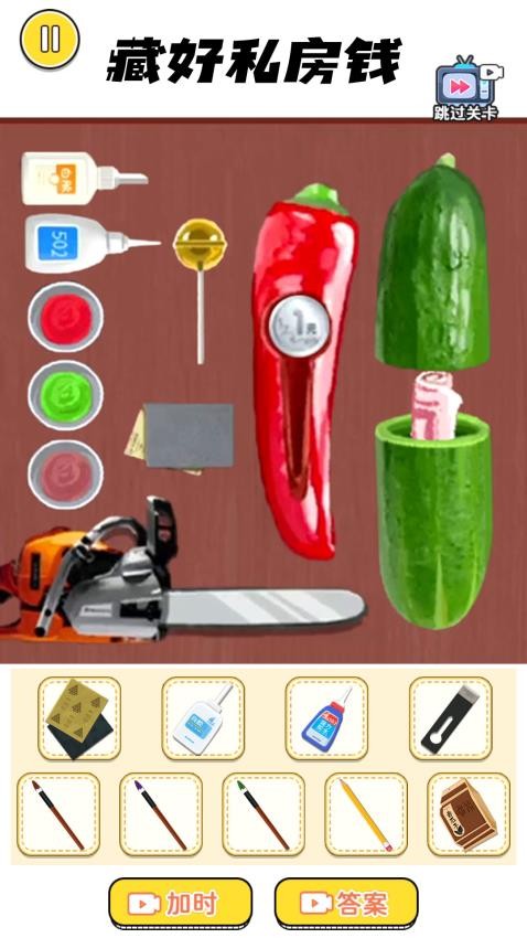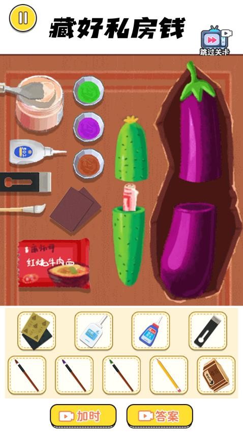 1、创意十足的藏钱挑战,通过制作蔬菜模型等隐蔽方式,将资金隐藏在看似普通的物品中,考验玩家的策略与想象力。