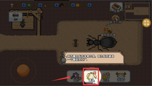 1、基础建设阶段,指挥工蚁采集食物与建材。通过拖拽划定工作区域,合理安排采集优先级,维持族群正常运转。