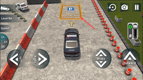 3、停车时,用方向、刹车等按键控警车,沿路线调整方向,精准驶入黄色框内的停车位,完成关卡。