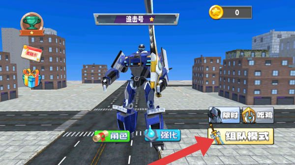 1、机甲名为“追击号”,界面有“角色”“强化”“组队模式”等功能按钮,还有“限时”“阵码”标识,背景是城市街道场景,呈现出机甲战斗游戏的养成与交互玩法。