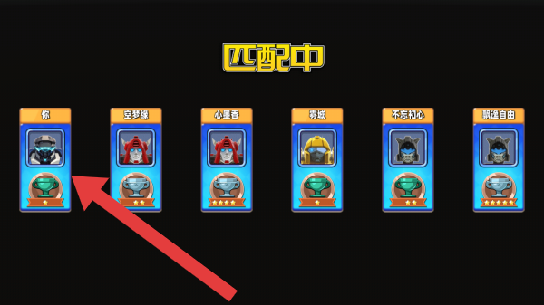 2、显示“匹配中”,有6个玩家头像及昵称,每个头像下有奖杯图标,呈现组队匹配对战的场景。