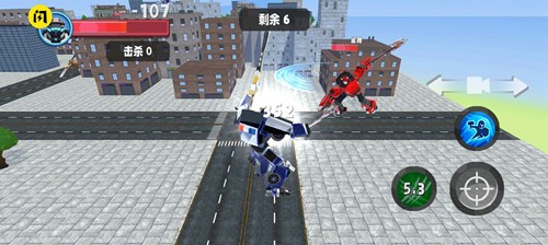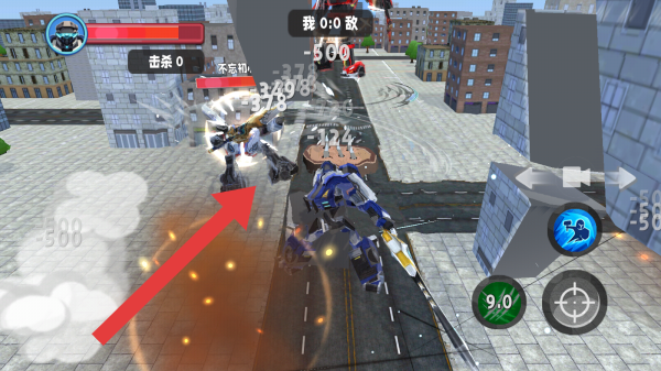 3、呈现出城市街道场景,有“我0:0敌”的对战信息,显示“击杀0”,画面中有多台机甲在战斗,界面分布血量条、技能按钮等,属于机甲格斗对战的实时战斗场景。