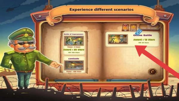 1、上方横幅文字“体验不同场景”,右侧“OnlineBattle”表示“在线战斗”,箭头所指是引导玩家点击进入在线战斗模式,还有不同战斗场景的选择展示。