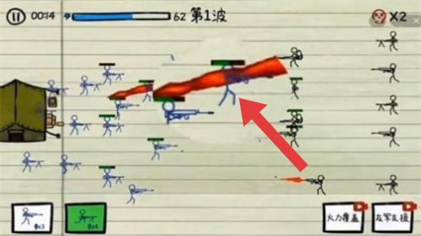 3、画面显示处于第1波战斗,有众多持武器的火柴人角色,下方有“火力覆盖”“友军支援”等功能按钮,红箭头所指的火柴人带有红色特效,是特殊角色或技能释放状态。