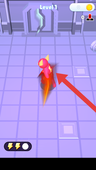 2、画面中粉色角色处于游戏第1关,角色身后有特效,箭头指示移动方向,左下角是技能的图标。